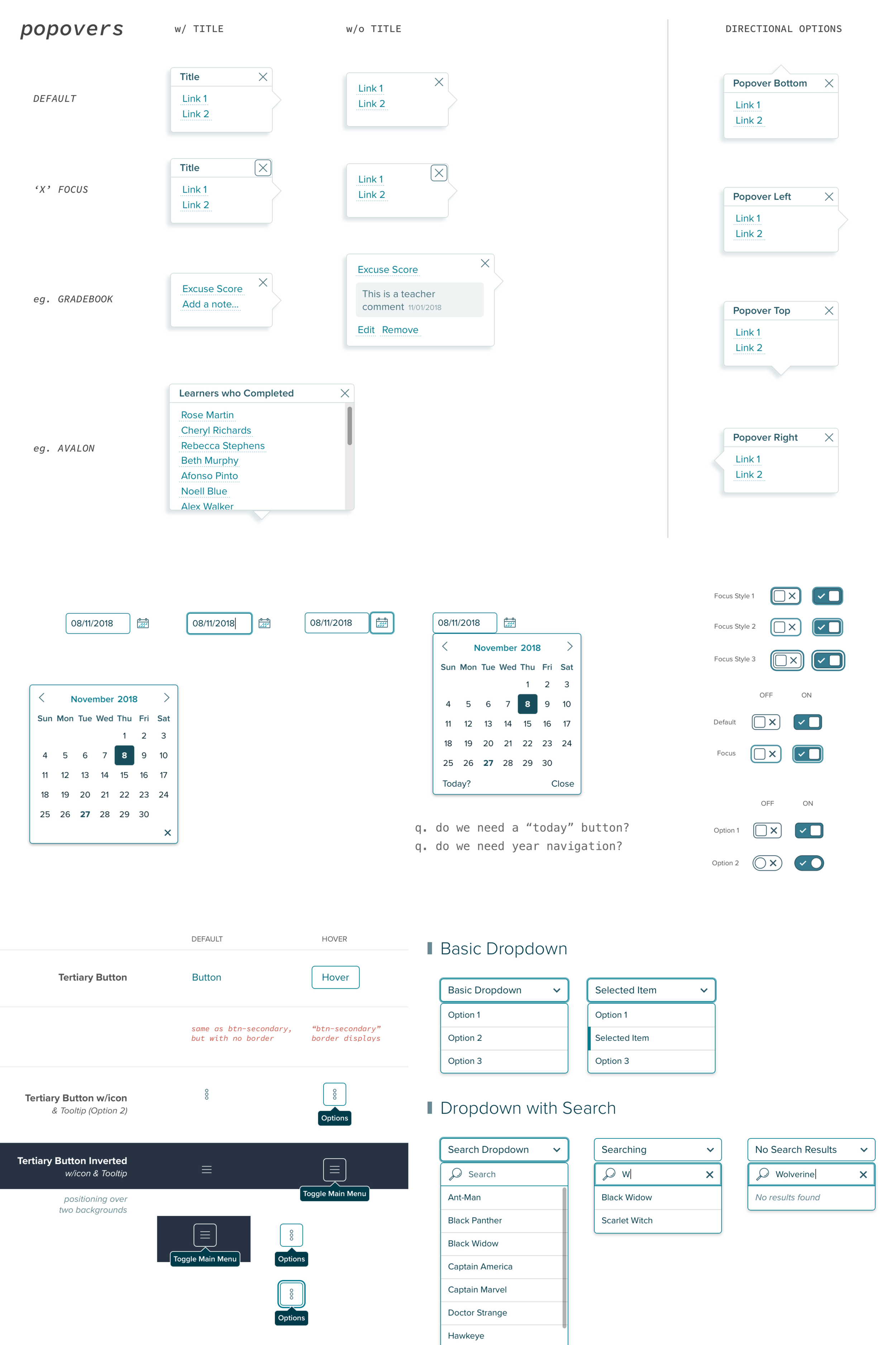 The exercise began with the visual design of Inputs and Buttons, the basic components within our system. Soon I was looking into more complex components like dropdowns, toggles, tooltips and popovers.